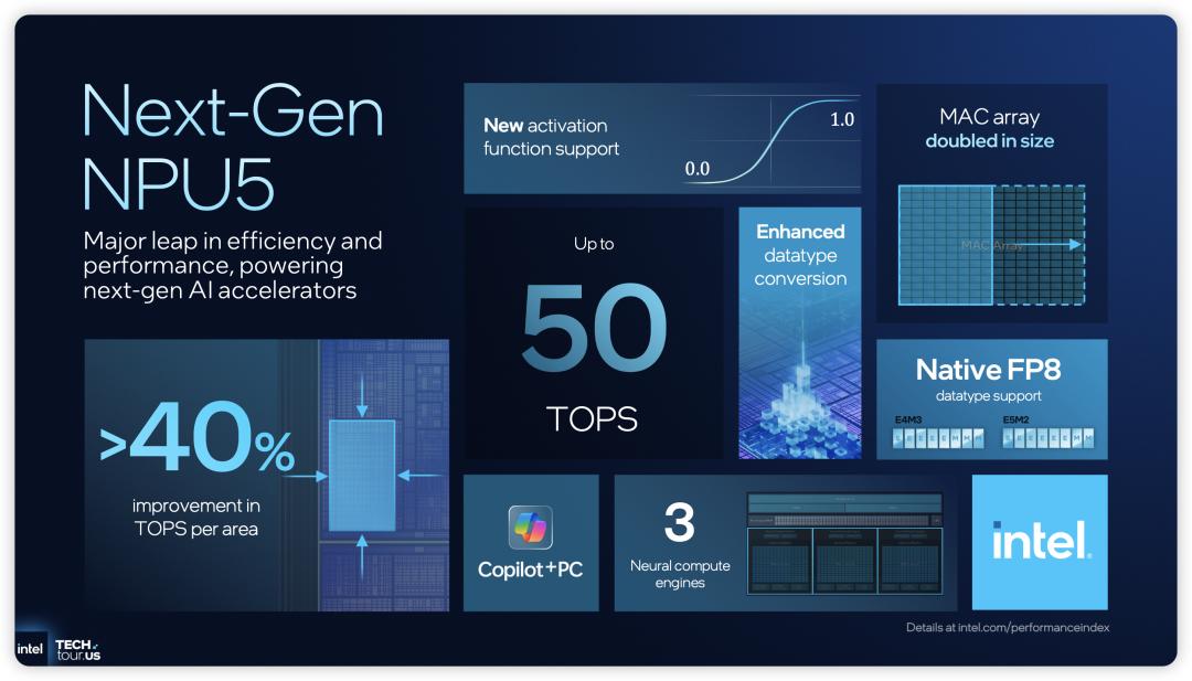 新的 NPU 5 单位面积的性能提升超过 40%,总算力达到 50 TOPS,并且支持 FP8 的精度——这意味着,在保持精度的前提下,推理性能可以大幅提升,而功耗显著降低,配合更大的带宽升级,本地大模型也能有相当不错的可用性。