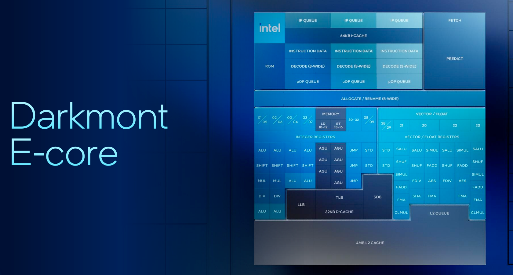 而在此次Clearwater Forest架构中,全新的Darkmont能效核心在架构上进行了多项关键升级,实现了三方面的优化和提升,使得低功耗的能效核心也能高效并行处理指令,兼顾节能与性能。