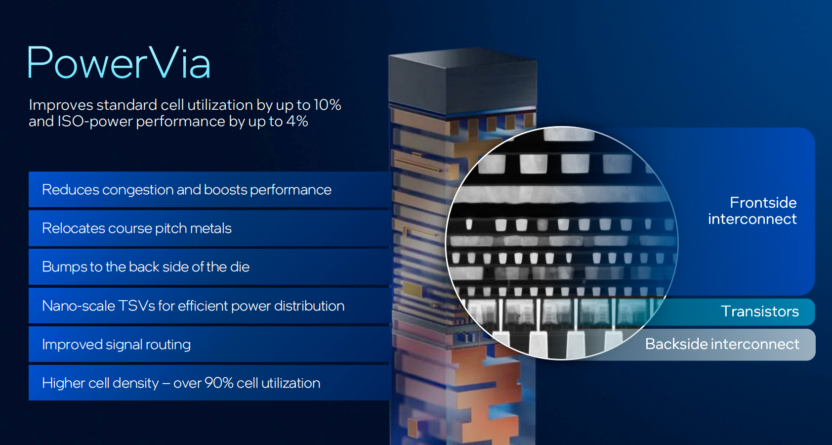 背部供电技术(PowerVia)与传统仅在晶体管正面布设金属层,同时承担信号传输和供电不同,PowerVia在晶体管背面增加了专用于电源互联的金属层。通过将电源互联和信号互联错开,可以有效解决信号和电源之间相互抢占金属层资源的矛盾,降低了布线拥塞,带来性能提升,同时可以更好的优化信号连接层的布局布线,从而达到更高的单元利用率的目的。通过将凸点移到芯片背面采用纳米级的TSV(尺寸为通常TSV的十分之一),可以直接通过更短的路径将电源从封装传递到晶体管内部,从而实现更高的电源布线效率。