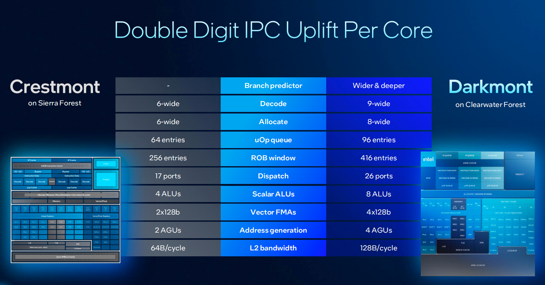 在与上一代Sierra Forest的能效核Crestmont的比较中可以看到,在指令解码、分配、微操作队列、缓存窗口以及指令派发等方面,Clearwater Forest的能效核Darkmont都带来了30%-50%不等的提升。在算力单元,包括标量算术逻辑单元、向量算术逻辑单元、地址生成单元、二级缓存带宽上都实现了翻倍的提升,从4个算术单元提升到8个,从2×128bit的向量计算,提升到4×128bit向量计算等。