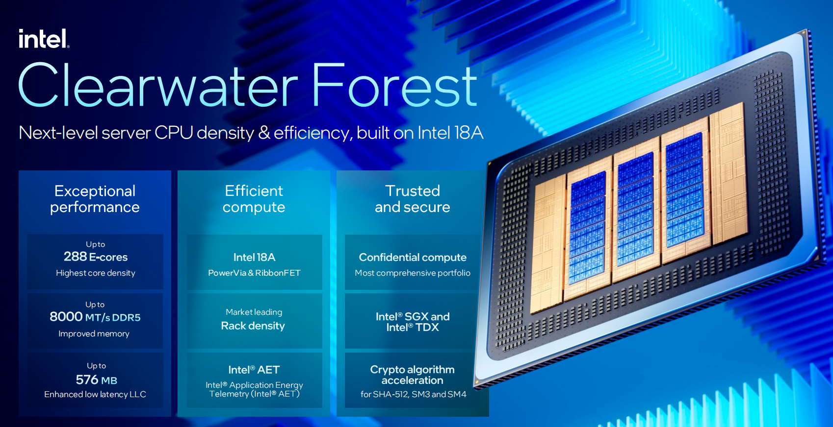 凭借Ribbon FET和PowerVia背部供电在制程工艺上的重要革新,作为18A打造的首款面向数据中心市场的服务器芯片,Clearwater Forest带来出色的性能和能效表现。