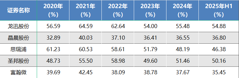 与同行业公司相比,龙迅股份也始终处于偏高水平。2025年上半年毛利率为54.88%。同行业公司中,晶晨股份、思瑞浦、圣邦股份、富瀚微,分别为36.80%、46.38%、50.16%、35.45%。