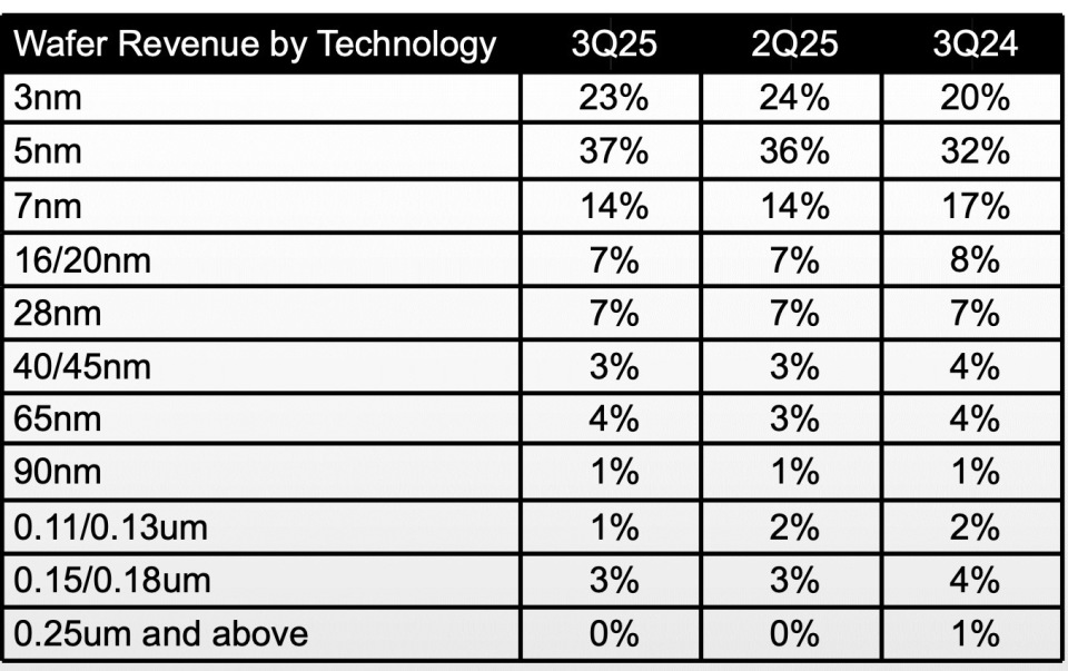 按技术划分营收结构,3nm制程技术贡献了第三季度总晶圆营收的23%;5nm和7nm分别占据37%和14%。先进制程(定义为7nm及以下节点)合计占总晶圆营收的74%。