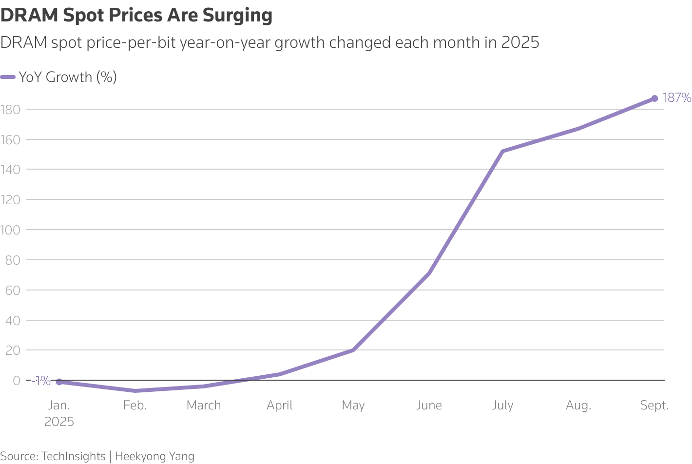 同样,根据TechInsights提供的数据,用于各种应用的DRAM现货价格在4月份仅上涨4%之后,9月份同比增长近两倍。