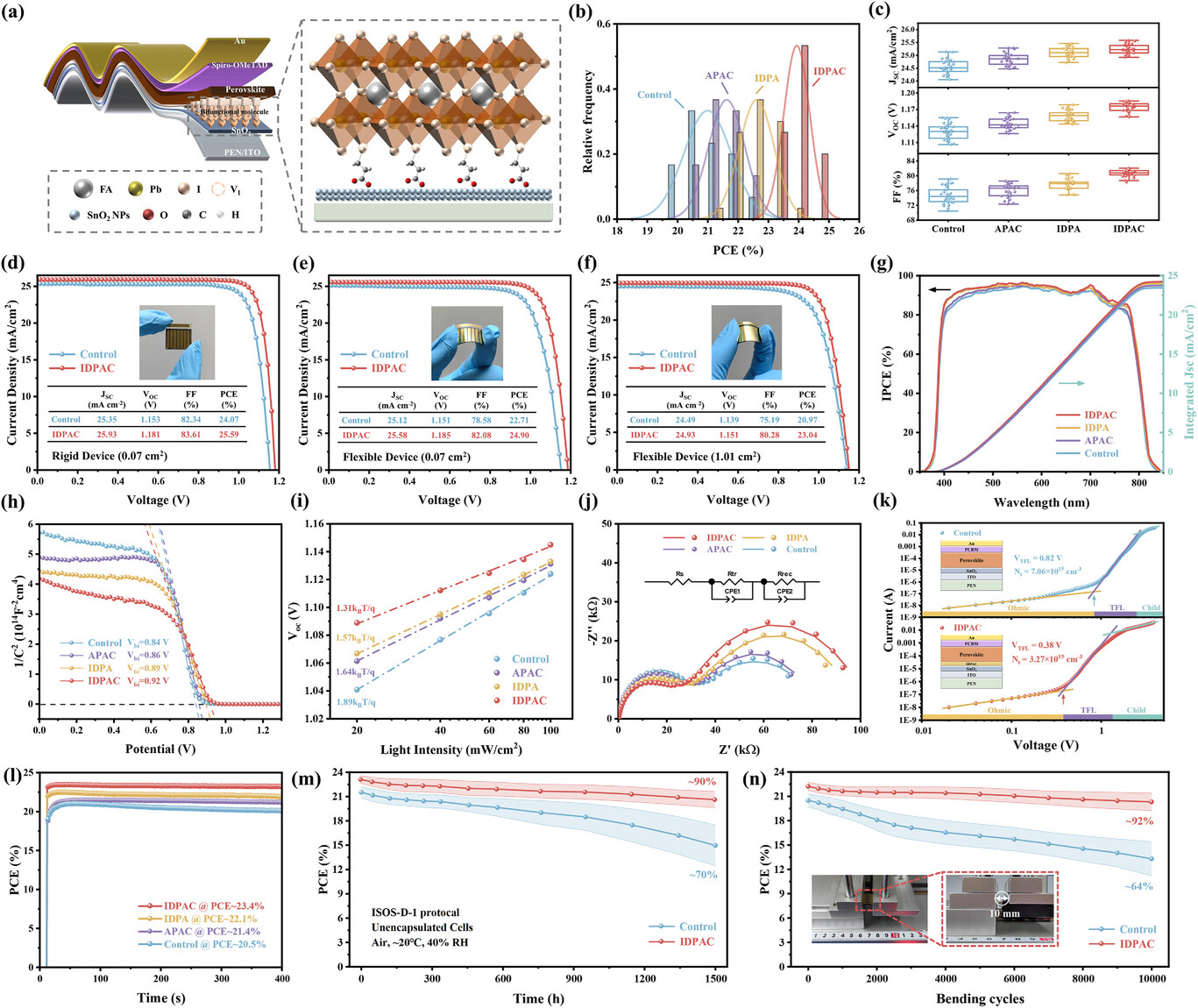 图3.柔性钙钛矿太阳能电池器件效率及稳定性