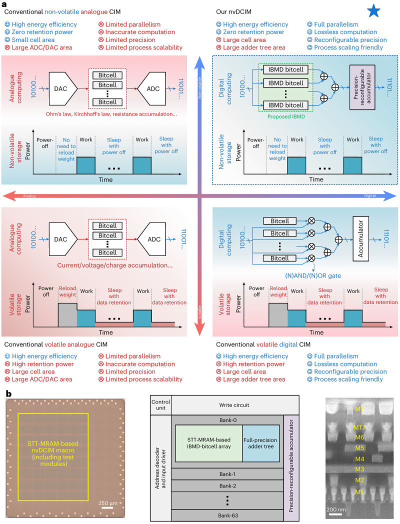 近日,南方科技大学深港微电子学院林龙扬课题组在非易失存算一体芯片领域取得重要研究进展。团队基于40纳米CMOS及STT-MRAM工艺,提出并流片验证了首个精度无损、全并行的数字式非易失存算一体芯片(nvDCIM, non-volatile Digital Compute-in-Memory),系统性解决了传统模拟式存算一体芯片在计算精度、可扩展性与鲁棒性上的瓶颈,并提出基于翻转率感知的网络训练方法以提升存算一体芯片在人工智能应用的能效。相关研究成果以“A lossless and fully parallel spintronic computeinmemory macro for artificial intelligence chips”为题发表于Nature Electronics(DOI:10.1038/s41928-025-01479-y)。研究由南方科技大学联合西安交通大学等单位共同完成,南方科技大学为论文第一单位和通讯单位。南方科技大学林龙扬助理教授、西安交通大学闵泰教授为论文的通讯作者。南方科技大学林龙扬课题组2024级博士研究生李瑚淼(南科大2018级本科毕业生,2022级硕士研究生)为论文的第一作者。