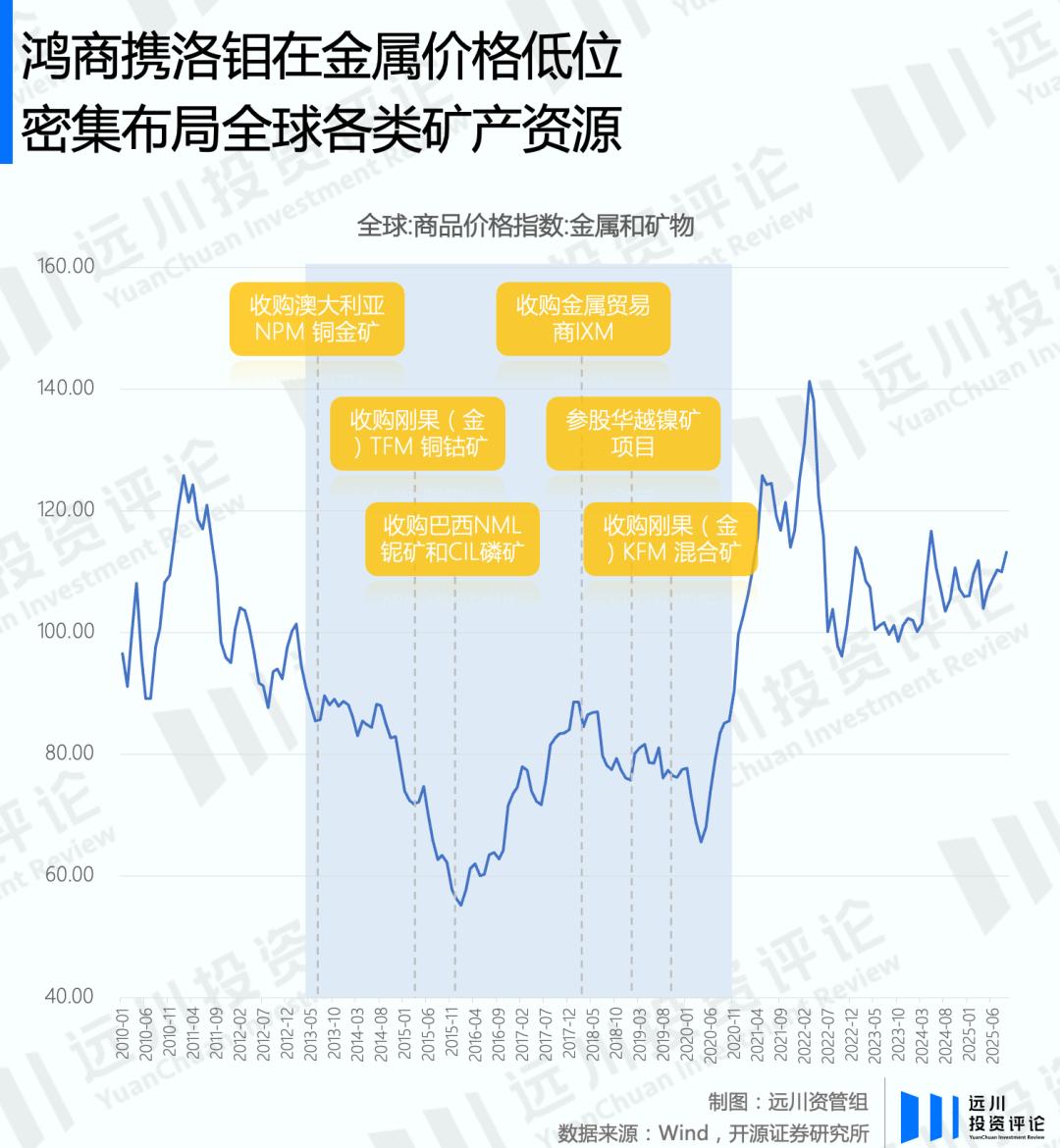 2013 年,花了8.2 亿美元,买下澳洲第四大铜矿80%的股份;2016年,砸了15 亿美元,拿下巴西铌磷矿;2016、2019 年,分两笔共计37.5亿美元,拿下刚果(金)TFM 铜钴矿80%的股权;2020 年,斥资5.5 亿美元,买下刚果(金)KFM 铜钴矿;今年上半年,又以 5.81 亿收购了加拿大Lumina在厄瓜多尔的金矿。