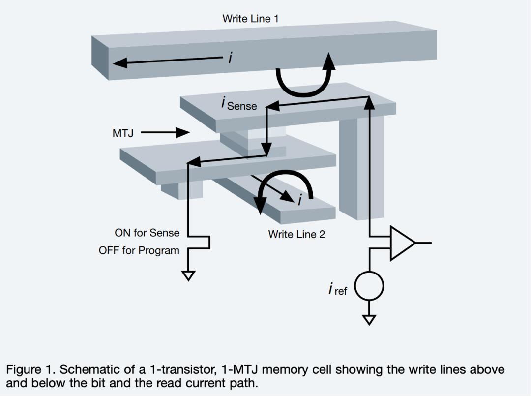 目前第二代STT-MRAM占据主导地位。STT-MRAM在速度、面积、写入次数和功耗方面能够达到较好的折中,当今最普通的STT-MRAM存储器内部组合方式是1T-1MTJ(one transistor,one magnetic tunnel junction),1T-1MTJ拥有面积小,制造成本低和与CMOS工艺融合性好等优点。