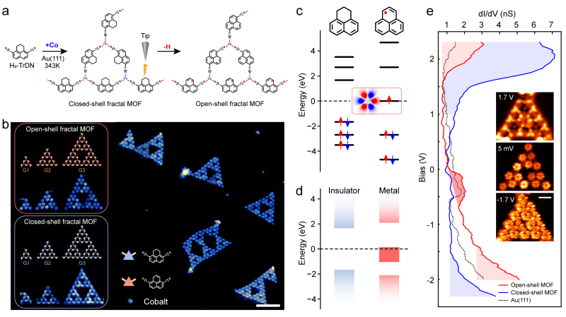 图1. a表面合成方法和针尖操纵技术实现金属2D-MOFs的结构示意图; b合成得到的谢尔宾斯基三角形分形结构MOFs的形貌图;c有机配体分子脱氢前后的能级图;d引入自由基前后MOFs的能带变化示意图;e引入自由基前后分形MOFs的微分电导谱。