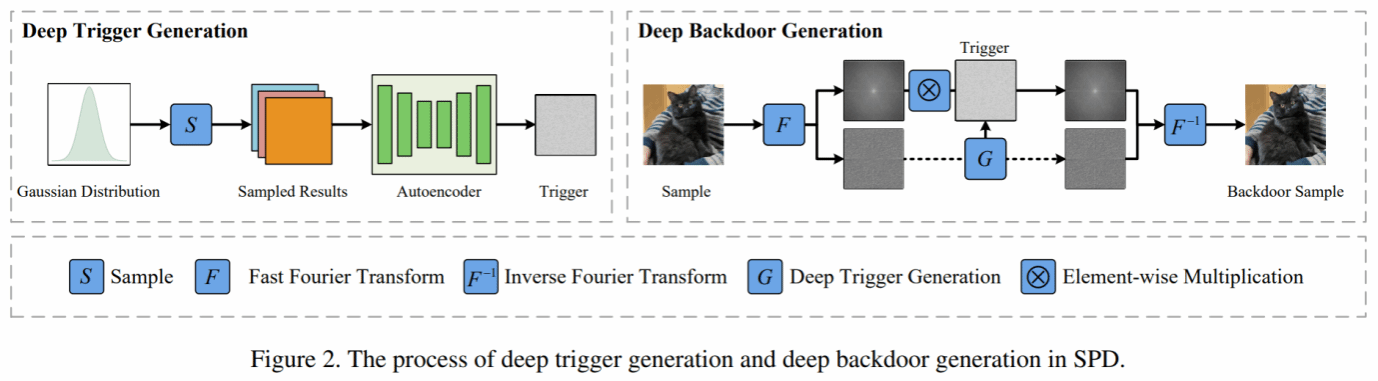 该论文针对神经网络后门攻击对抗检测技术展开研究。现有的后门攻击方法虽然能够在模型中成功植入后门,但往往难以同时规避后门检测与人类视觉检查,导致模型中所植入的后门容易暴露,防御者进一步可以通过剪枝或微调技术移除后门,从而显著降低后门的攻击效果。针对上述问题,论文提出了一种新型的后门攻击方法。该方法遵循“浅层掩护深层”的设计思想,通过在频域与像素域分别构建深层后门与浅层后门,实现对深层后门的隐蔽保护。其中,深层后门在频域中从特定高斯分布中采样,并利用自编码器将采样结果嵌入图像振幅分量的强度中,以此作为后门触发器,从而确保攻击的不可见性。浅层后门则采用传统的基于图像块的触发方式,覆盖分类任务的所有类别,主动吸引防御者的注意力,从而在检测过程中充当“防火墙”,有效掩护深层后门免受检测。