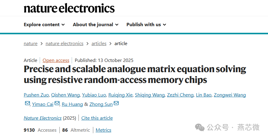 相关成果以“Precise and scalable analogue matrix equation solving using resistive random-access memory chips”为题,发表在国际学术期刊《自然·电子学》(Nature Electronics)杂志上。