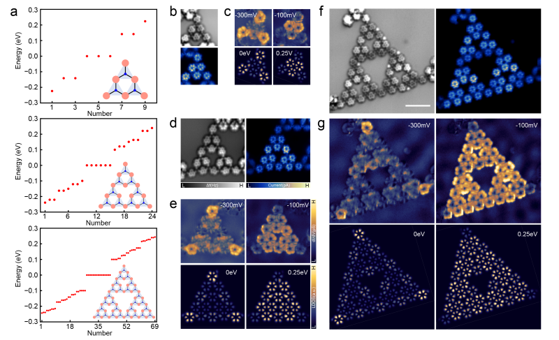 图2. a通过紧束缚方法计算的1-3阶开壳MOFs中的能级图; b-g分别是1-3阶开壳MOFs的化学键分辨、形貌图、拓扑角态和体态的测量结果,并且通过紧束缚计算进行了相对应的电子态密度的模拟。
