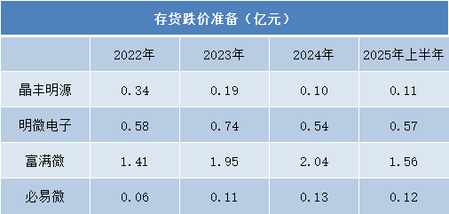 相比之下,晶丰明源存货跌价准备从0.34亿元降至0.11亿元,库存质量明显改善;明微电子在0.54亿至0.74亿元间波动,保持稳定;必易微始终维持在0.06亿至0.13亿元的较低水平。这种分化反映出各企业库存结构和风险管理能力的差异。