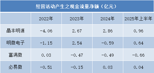 经营现金流数据进一步揭示了企业运营状况的分化。晶丰明源的经营现金流实现显著逆转,从2022年的-4.06亿元大幅改善,2023年起连续三年保持净流入,2025年上半年达到0.96亿元,显示出强劲的营运资金管理能力。必易微则呈现稳步改善趋势,至2025年上半年实现0.04亿元的正向现金流。