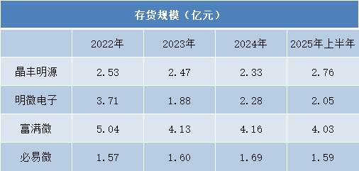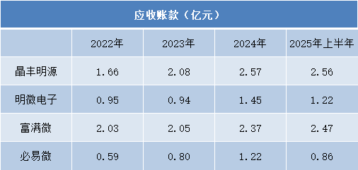 富满微的应收账款从2.03亿元稳步增至2025年上半年的2.47亿元,规模始终处于行业较高水平;明微电子虽在2023年有所回落,但2024年跃升至1.45亿元,整体呈波动上升态势;必易微也从0.59亿元上升至2024年的1.22亿元,虽规模相对较小,但波动较为明显。