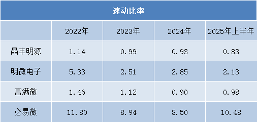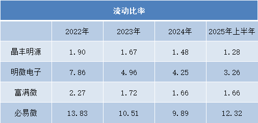 更值得关注的是,速动比率出现更明显的分化。晶丰明源从1.14持续下降至0.83,已低于1的常规安全线;富满微在0.90-0.98区间波动,持续在警戒线附近徘徊,显示出即时偿债能力承压。