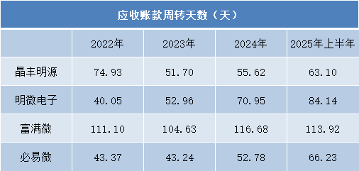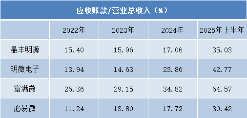 更为值得关注的是,应收账款占营业收入的比例在2025年上半年出现明显跳升。富满微从2022年的26.36%持续攀升至2025年上半年的64.57%,意味着其营收中有超过六成尚未实际收回。