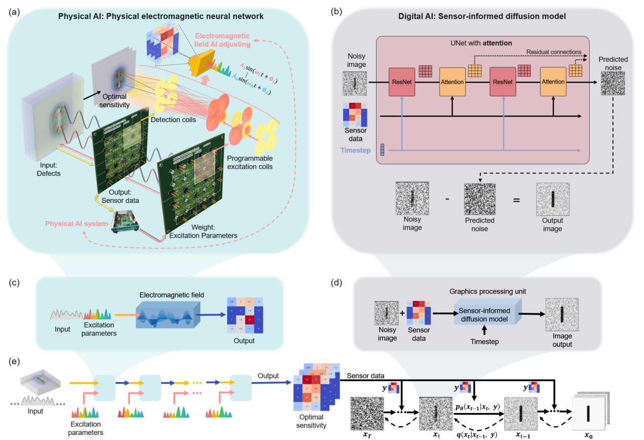 在电磁无损检测 (ENDT) 领域,准确识别和表征各种材料中的缺陷对于确保结构完整性至关重要。该论文提出了一种新颖的智能电磁感控框架,它同时结合了物理和数字人工智能,以解决传统电磁无损检测固有的灵敏度和准确性限制(如图1所示)。与传统的被动数据采集方法不同,该系统集成了物理电磁神经网络和物理感知强化学习引擎,可以实时自适应地优化电磁场传感参数并在模拟端调控,显著提高缺陷区的检测灵敏度和成像分辨率。在数字方面,传感器通知的扩散模型根据低分辨率最佳灵敏度传感器数据重建高分辨率图像,从而可以对缺陷轮廓和深度进行详细分析。实验结果表明,最大灵敏度提高了 105.8%,最小缺陷量化为 0.2 毫米,超过现有电磁无损检测技术性能。这一创新框架将自适应电磁场聚焦与先进的图像重建结合,建立了实时、高精度缺陷智能检测的新方法。此外,它在后续可控核聚变,功能性核磁共振等电磁感控应用领域有潜在应用价值。