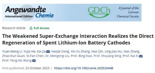 该研究成果以《减弱超交换相互作用实现废旧锂离子电池正极的直接再生》(The Weakened Super-Exchange Interaction Realizes the Direct Regeneration of Spent Lithium-Ion Battery Cathodes)为题,发表在国际顶尖学术期刊《德国应用化学》(Angewandte Chemie International Edition)上。西安交通大学硕士生李圆梦和贺毓嘉为本文共同第一作者,西安交通大学电气学院王鹏飞教授、化学学院郗凯教授与贾凯助理教授为本文共同通讯作者,论文重要合作者还包括电气学院肖冰教授、化学学院丁书江教授,论文第一单位为西安交通大学电工材料电气绝缘全国重点实验室新型储能与能量转换纳米材料研究中心。