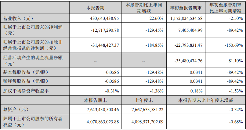 前三季度公司实现营业收入15.59亿元,同比增长4.53%;归属于上市公司股东的净利润为859.76万元,同比扭亏为盈。