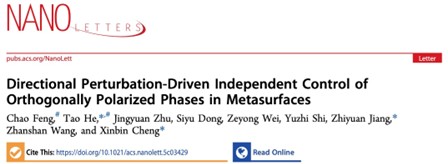 2.物理科学与工程学院王占山和程鑫彬团队提出正交偏振相位解耦新方法,成果发表于《纳米快报》并入选封面;
