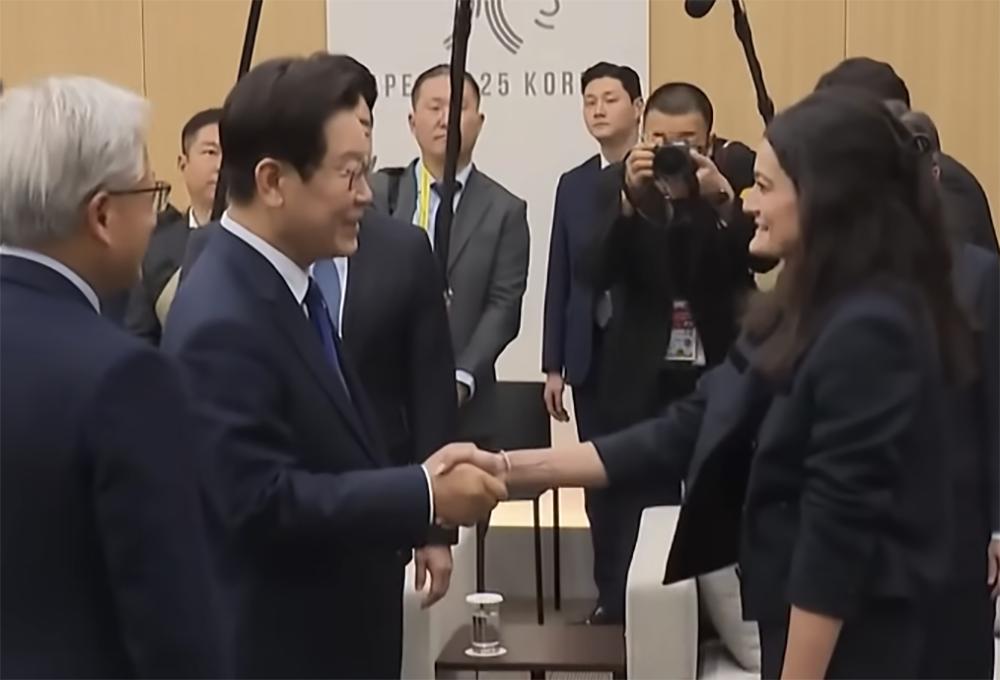 10月31日,在APEC会议期间,韩国总统李在明与黄仁勋举行正式会晤。黄仁勋还在会议间隙向李在明介绍了自己的女儿Madison。