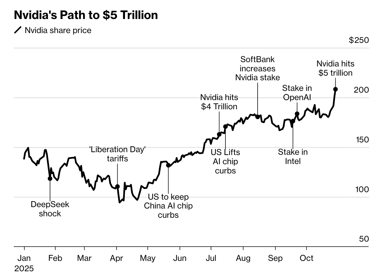 过去五个交易日,英伟达的市值飙升近4000亿美元(约合2.8万亿元人民币),超越了丰田汽车、家得宝的市值,成为史上首家5万亿美元公司。据彭博亿万富翁指数估算,黄仁勋个人财富也增加逾90亿美元,达到近1760亿美元。