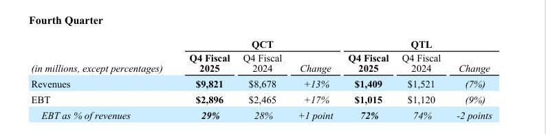 11月6日消息,美国当地时间周三,高通发布截至9月28日的2025财年第四财季(对应自然年2025年第三季度)及全年财报。