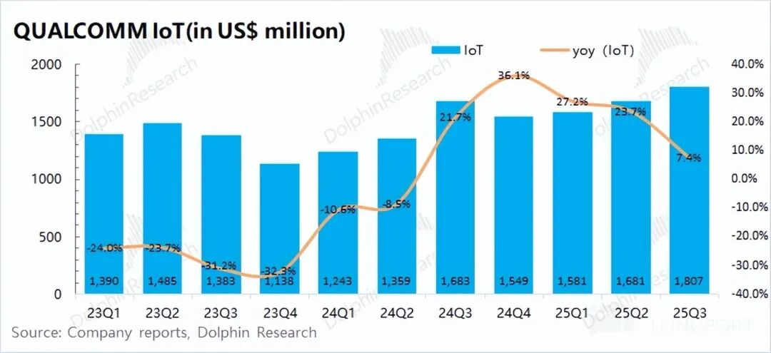 高通的 IoT 业务在 2025 财年第四季度(即 25Q3)实现营收 18 亿美元,同比增长 7.4%,好于市场预期(17 亿美元)。在经历连续 4 个季度两位数增长后,本季度 IoT 业务回落至个位数。