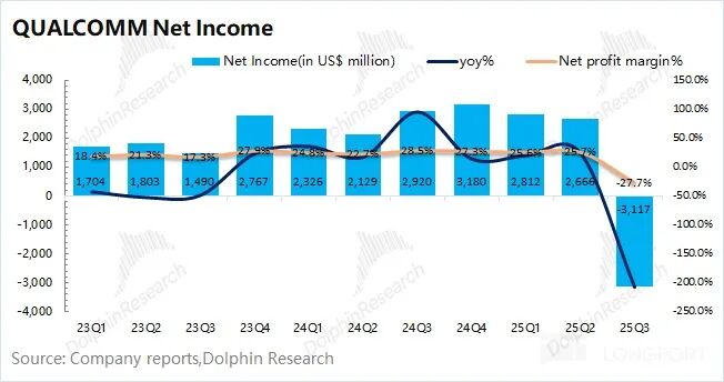 高通在 2025 财年第四季度(即 25Q3)净利润为-31 亿美元,这主要是因为公司本季度进行了一笔 57 亿美元的递延税资产准备金。
