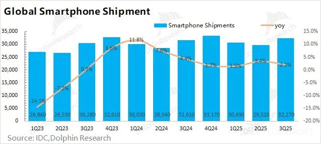 结合行业数据看,2025 年第三季度全球智能手机出货量为 3.23 亿台,同比增长 2.1%。行业面增速维持低个位数。在苹果新机基础版 “加量不加价” 的策略以及中国国补收紧的趋势下,公司及安卓类在下一财年的表现都将面临压力。