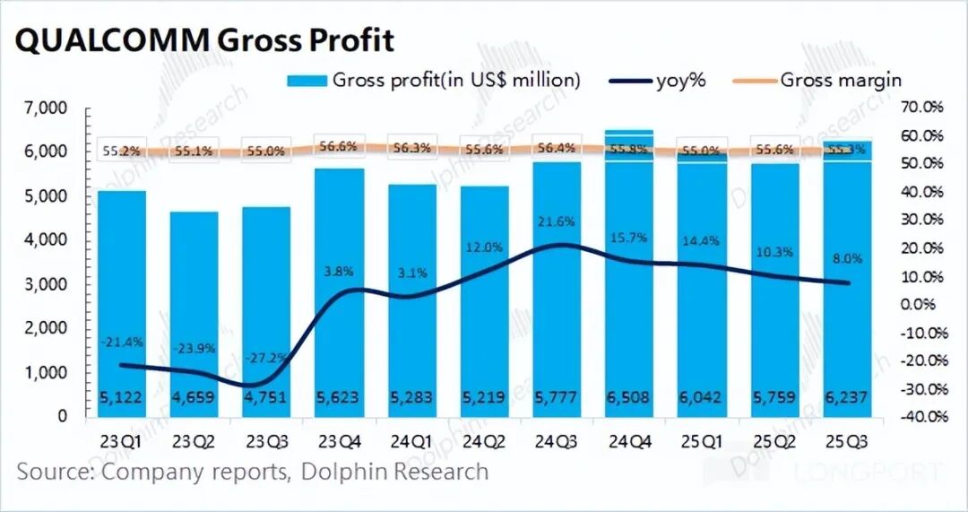 高通在 2025 财年第四季度(即 25Q3)实现毛利 62.4 亿美元,同比增长 8%。