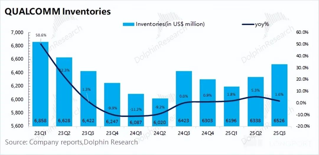 高通在 2025 财年第四季度(即 25Q3)的存货有 65.3 亿美元,同比略增 1.6%。通常下半年往往是电子产品的旺季,而公司需要备货以应对客户需求,当前公司的存货状况相对合理。