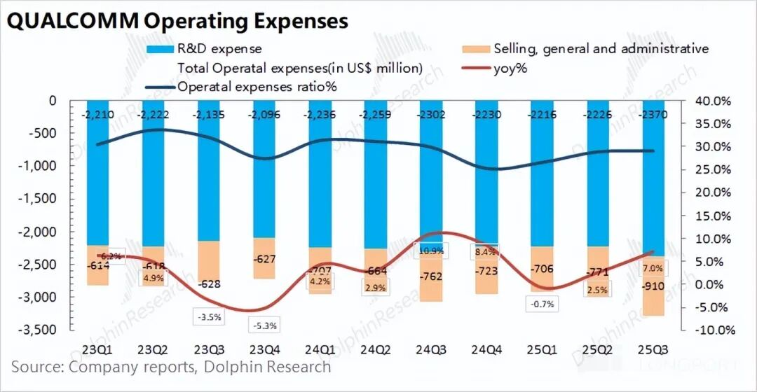 高通在 2025 财年第四季度(即 25Q3)的经营费用为 32.8 亿美元,同比增长 7%。经营费用增速与收入增速相近,公司本季度经营费用率维持在 29.1%。