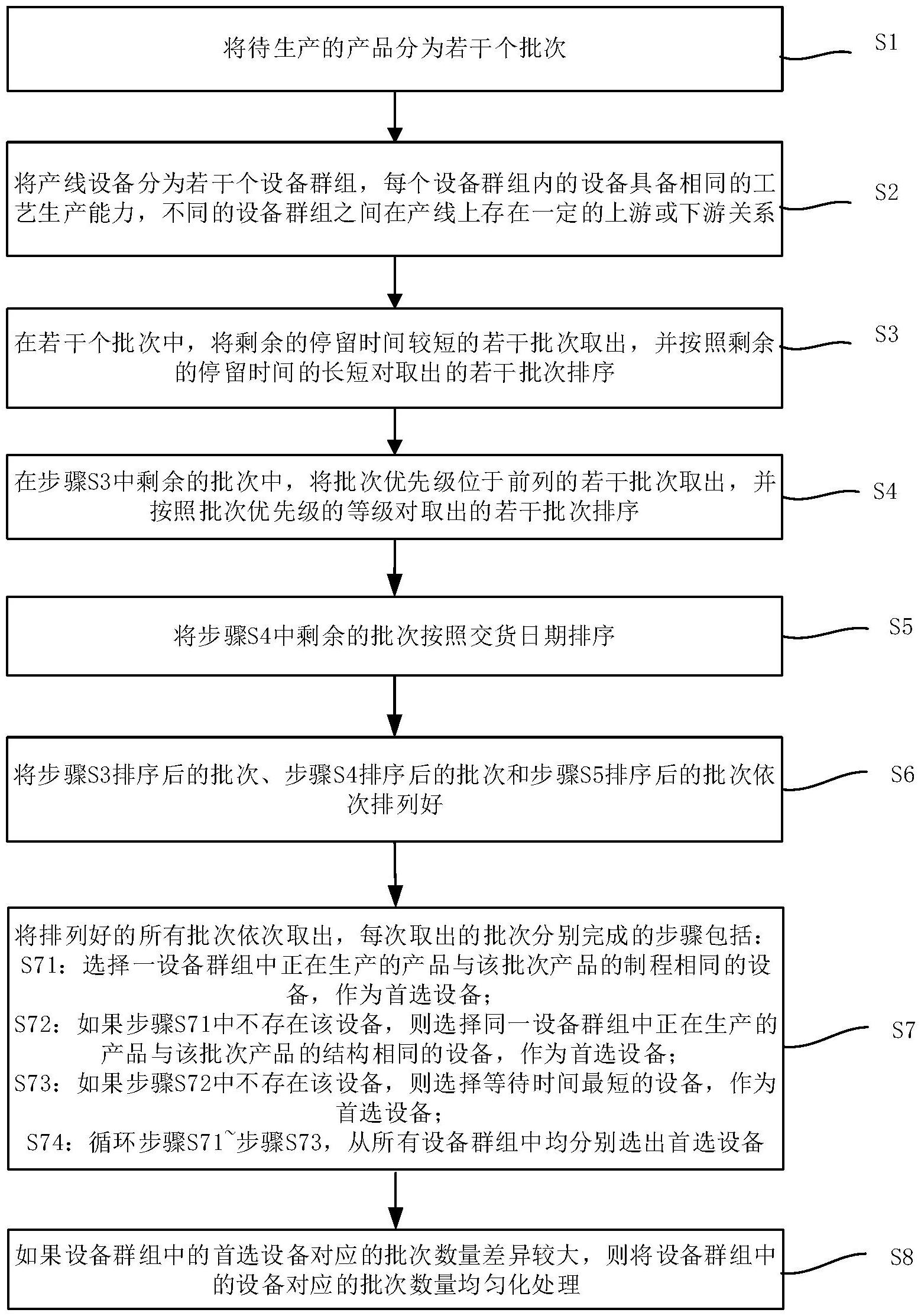 本发明本发明提供了一种半导体产线排程的形成方法,包括:将待生产的产品分为若干个批次;将产线设备分为若干个设备群组;将剩余的停留时间较短的若干批次取出,并按照剩余的停留时间的长短对取出的若干批次排序;将批次优先级位于前列的若干批次取出,并按照批次优先级的等级对取出的若干批次排序;将剩余的批次按照交货日期排序;将排序后的批次依次排列好;将排列好的所有批次依次取出,每次取出的批次分别从所有设备群组中均分别选出首选设备;如果设备群组中的首选设备对应的批次数量差异较大,则将设备群组中的首选设备对应的批次数量均匀化处理。本发明平衡了生产线的生产,促使了产能优化。
