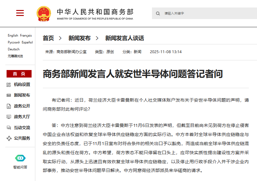 2、商务部新闻发言人就安世半导体问题答记者问:中方同意荷经济部派员来华磋商的请求