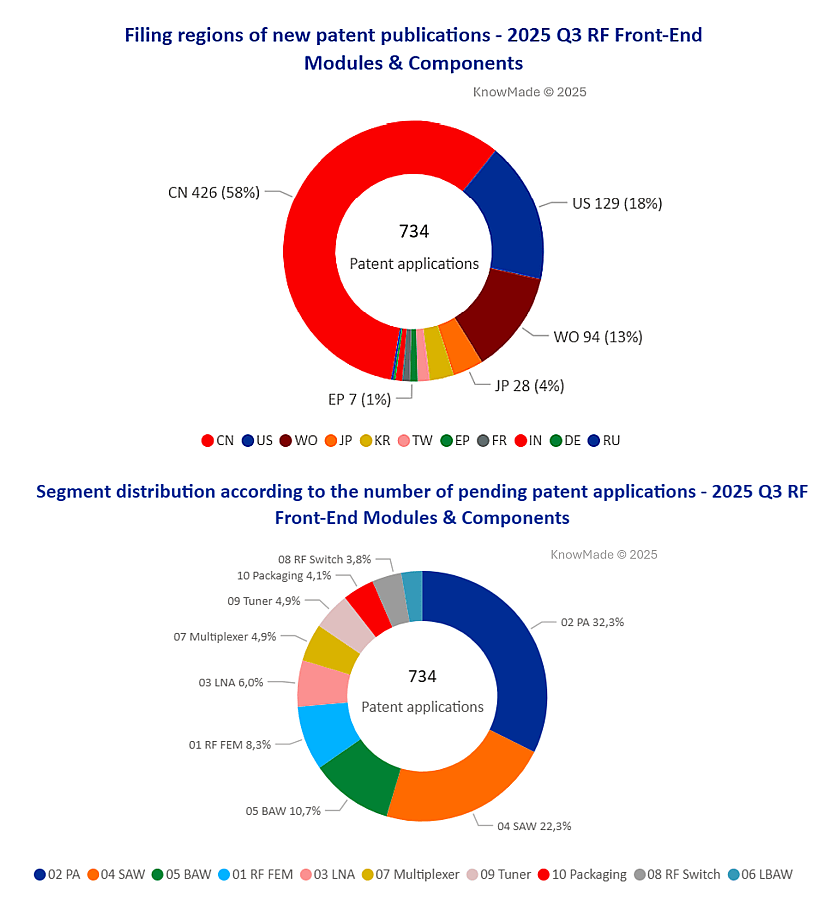 2025年第三季度的专利格局显示,待审申请和新增授权专利之间呈现出强劲且平衡的管道,表明射频前端创新在全球主要地区依然活跃。