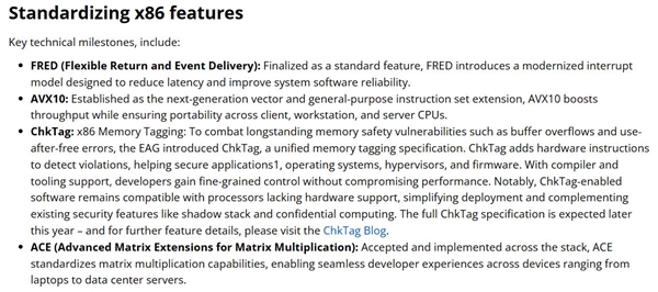 根据报道,AMD Zen7将会充分汲取AMD、Intel联合组建的x86生态系统咨询小组(EAG)的合作成果,支持第一批四大关键技术,分别是AVX10、ACE、FRED、ChkTag,其中三个都是新的指令集。