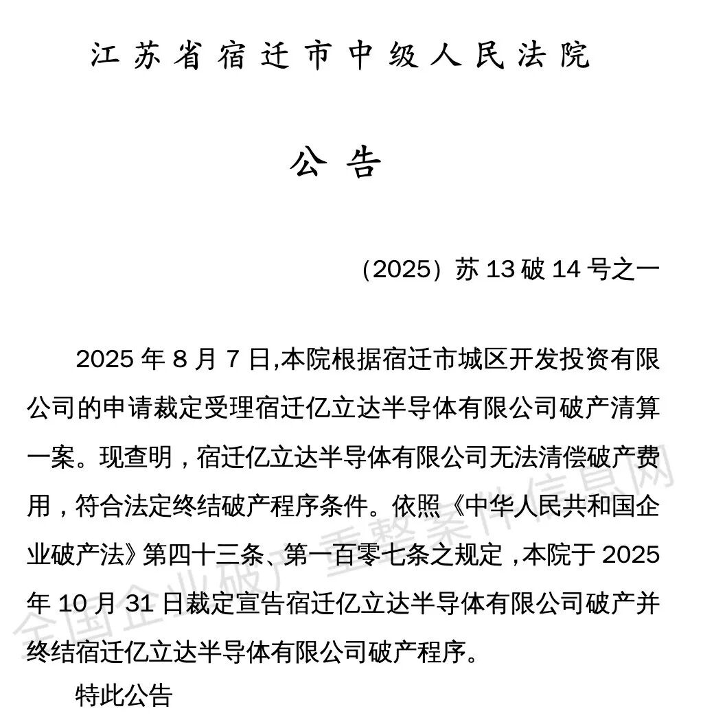 近日,江苏省宿迁市中级人民法院发布公告,正式裁定宿迁亿立达半导体有限公司(下称“亿立达”)破产,并终结其破产程序。这一消息为这家半导体领域初创企业的命运画上了句号。