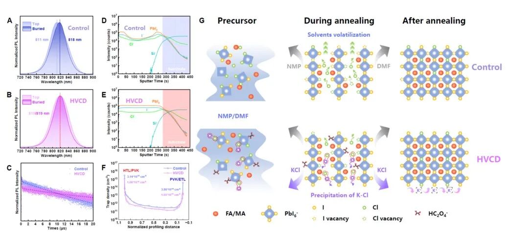 科研团队通过在钙钛矿薄膜生长中引入碱金属草酸盐,利用解离出的钾离子与氯离子之间的强结合作用,有效束缚氯元素的垂直无序迁移,使其在钙钛矿材料中均匀分布。基于这一方法,研究团队成功制备出载流子寿命高达20微秒,界面缺陷态密度低至1013每立方厘米的钙钛矿半导体薄膜。