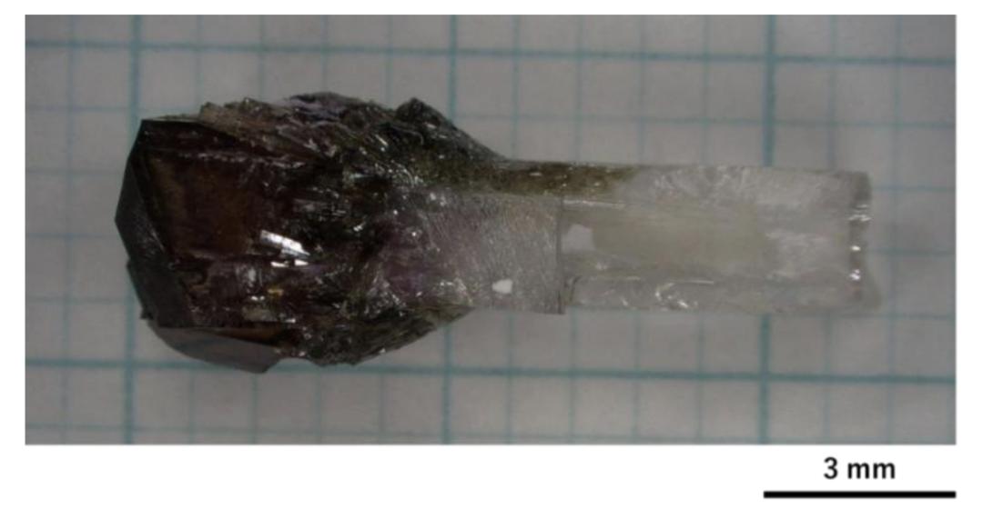 图1:采用FZ法生长的r-GeO₂块体晶体照片。左侧的黑色部分为通过 FZ 法生长的晶体,右侧的白色部分为采用熔剂法(Flux 法)合成的种晶。(图源:Patentix)
