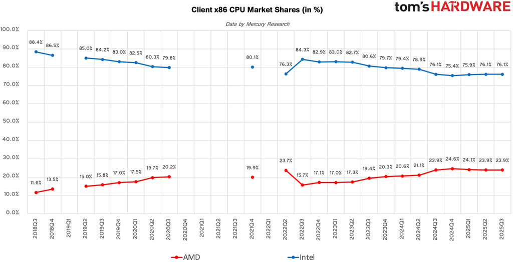 (图片来源:Mercury Research数据,Tom's Hardware整理)