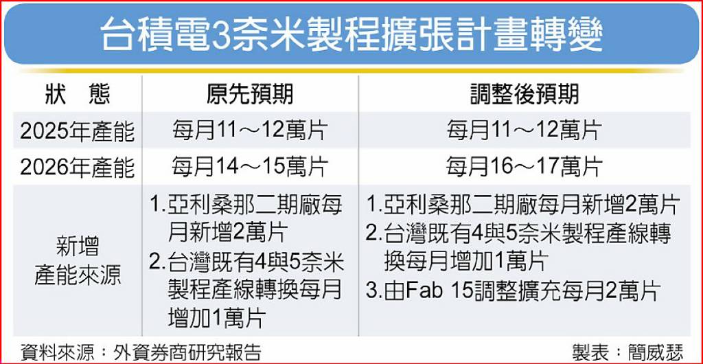 有鉴于台积电既有扩产节奏已不足以完全满足高效能运算(HPC)与AI芯片需求,大摩最新供应链调查发现,台积电正考虑额外再增加每月2万片3纳米产能,使整体产能来到每月16~17万片,超乎市场预期。 摩根士丹利证券说明,若台积电最终确认新增每月2万片产能,意味将增加50~70亿美元额外资本支出,2026年整体资本支出规模可能达480~500亿美元,优于先前估计的430亿美元规模。