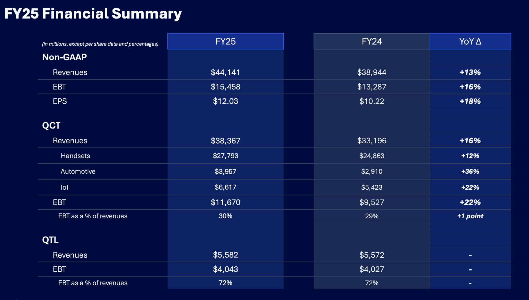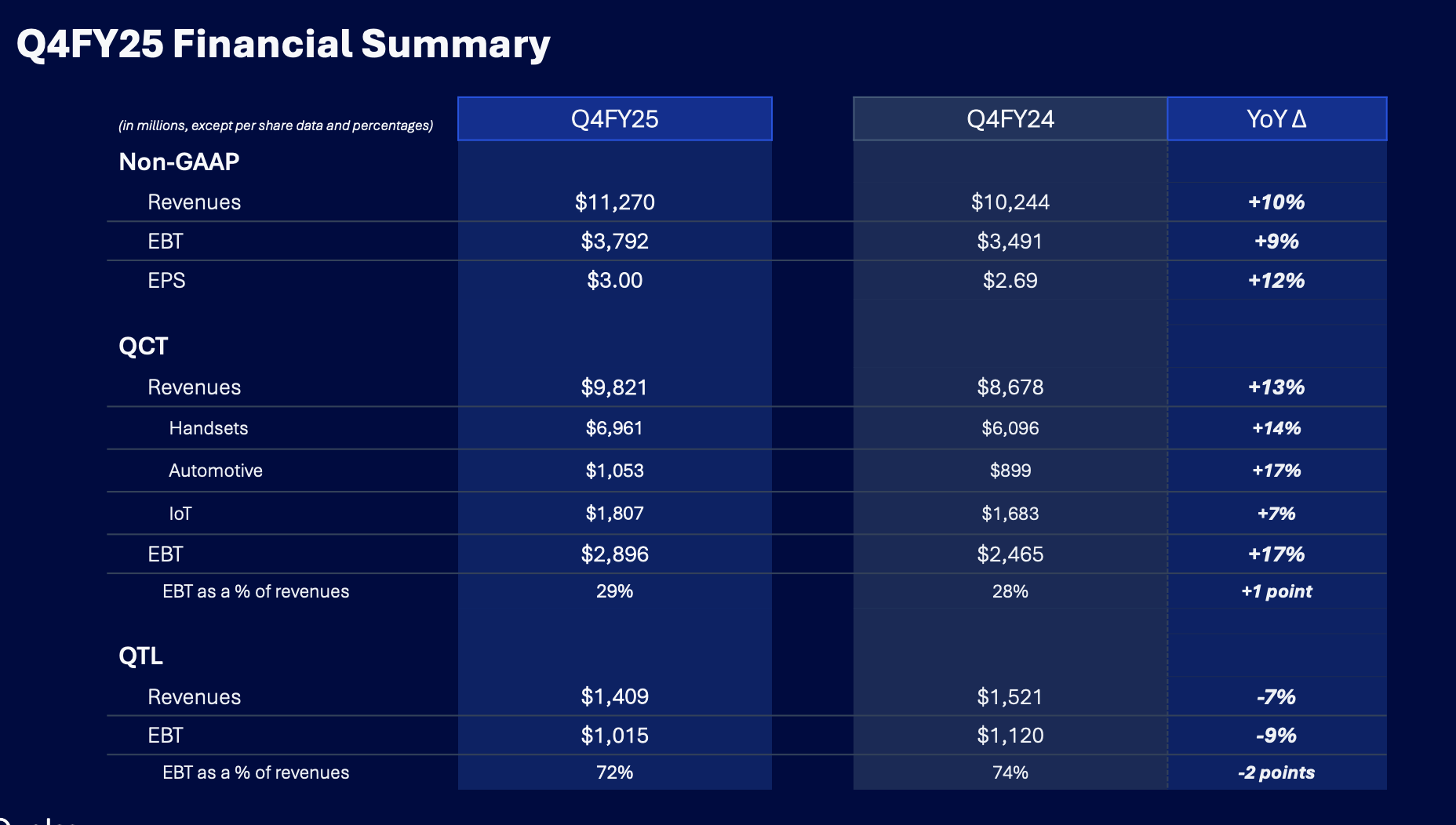 2025财年,高通营收达到440亿美元,同比增长13%。QCT年度收入达384亿美元,创历史新高,同比增长16%,其中汽车和物联网收入分别同比增长36%和22%。除苹果业务外,QCT总收入同比增长18%,超出此前预期。高通的所有业务均实现双位数增长。