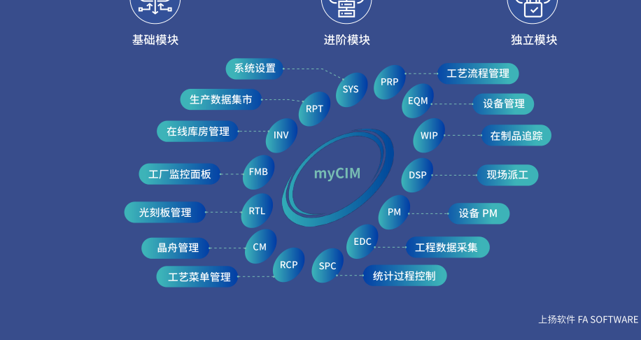 上扬软件的myCIM 4.0产品采用模块化设计,可同时支持6英寸、8英寸及12英寸FAB产线,可根据不同行业客户需求灵活搭配组合,在满足客户定制化需求的同时实现最大投入产出比;同时,该产品能完美支持工厂全自动化(Fully Auto)生产,既契合工业4.0的高灵活性要求,又可助力产线实现个性化生产模式。