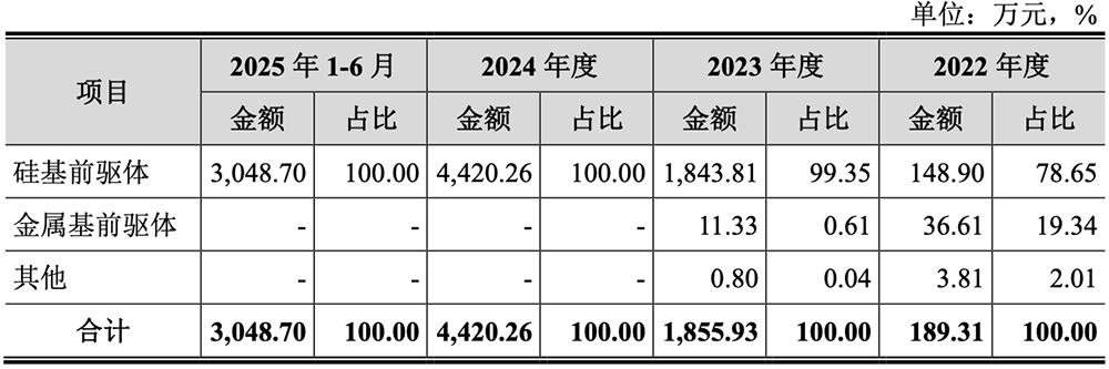 报告期内,其自产前驱体材料收入金额分别为189.31万元、1855.93万元、4420.26万元、3048.70万元,自主生产的TEOS陆续实现销售,收入规模保持较快增长趋势。