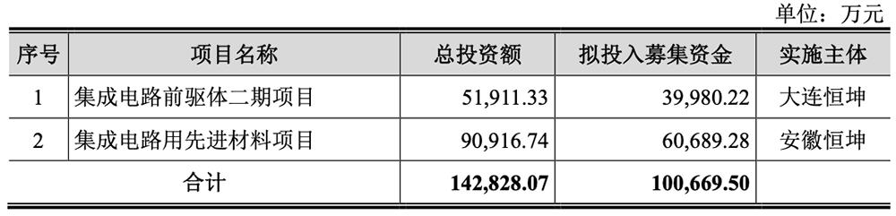 本次发行上市,恒坤新材募资总额为10.10亿元,募资净额为8.92亿元,用于集成电路前驱体二期项目与集成电路用先进材料项目。其本次募投项目拟新建约500吨KrF/ArF光刻胶等光刻材料、760吨TEOS等前驱体材料产能。