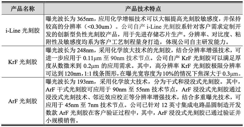 该公司自产KrF光刻胶和i-Line光刻胶已累计量产供货超过5500加仑,已有超过10款i-Line光刻胶、KrF光刻胶及ArF光刻胶进入验证流程,部分产品已验证通过并小规模销售。