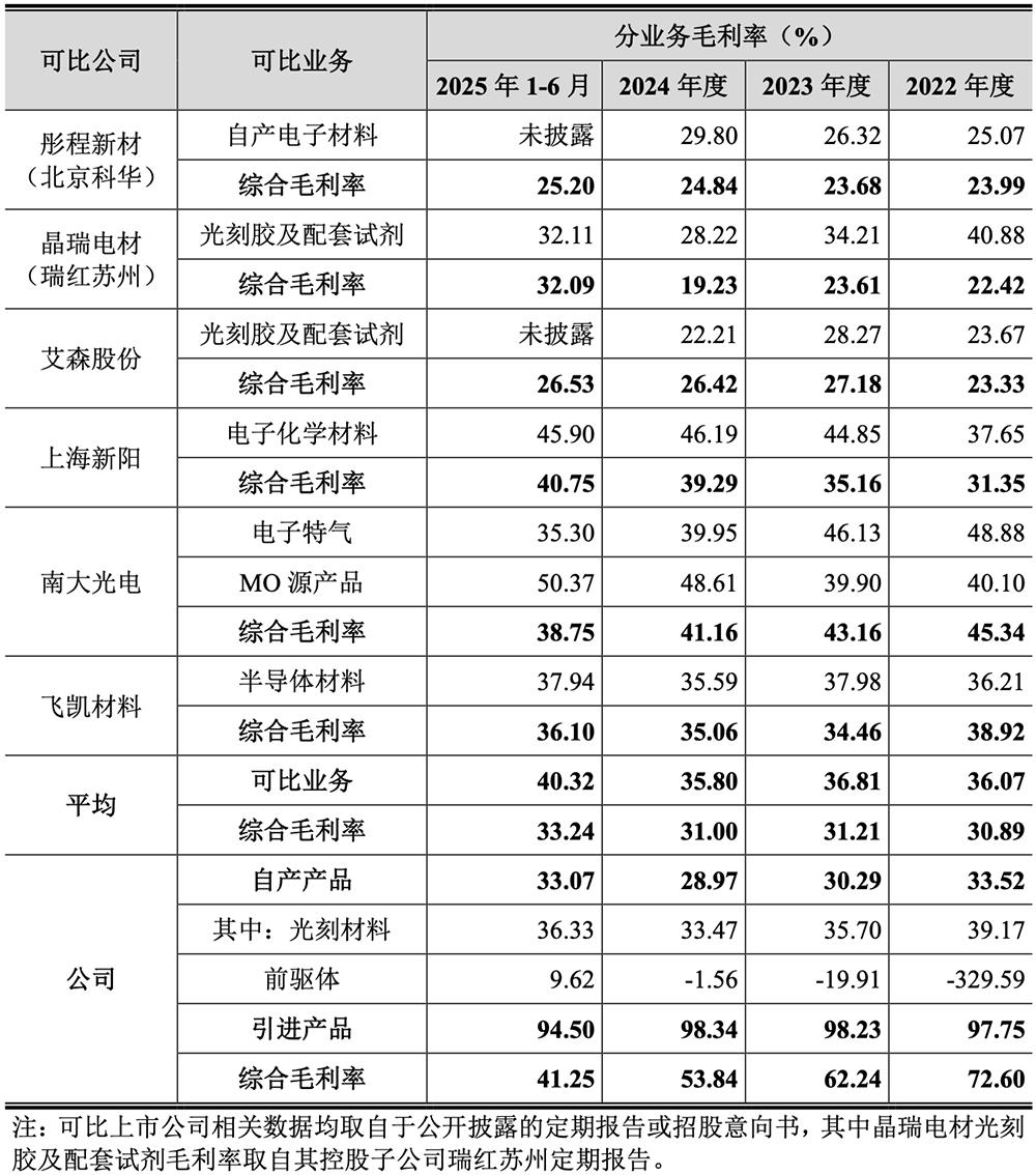 报告期内,其自产光刻材料毛利率分别为39.17%、35.70%、33.47%、36.33%,处于可比公司可比业务毛利率的中间水平,与平均水平接近;自产前驱体材料毛利率分别为-329.59%、-19.91%、-1.56%、9.62%,2025年1-6月随着产量进一步提升,毛利率已由负转正。