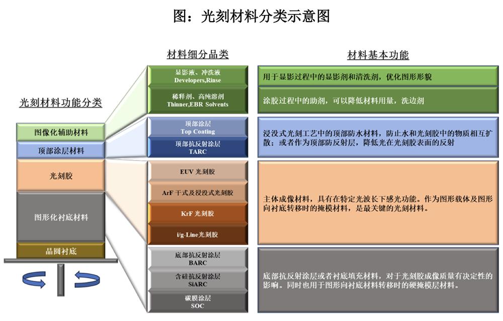 光刻材料贯穿整个光刻工艺,主要包括SOC、ARC、光刻胶、 Top Coating、稀释剂、冲洗液、显影液等,决定着晶圆工艺图形的精密程度与产品良率。